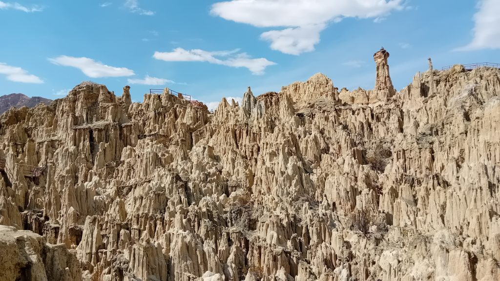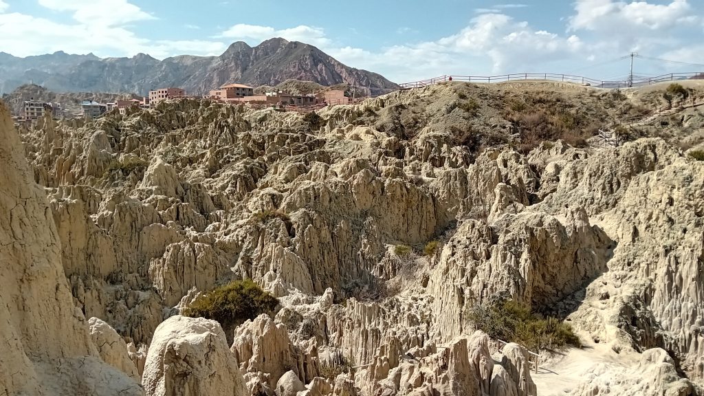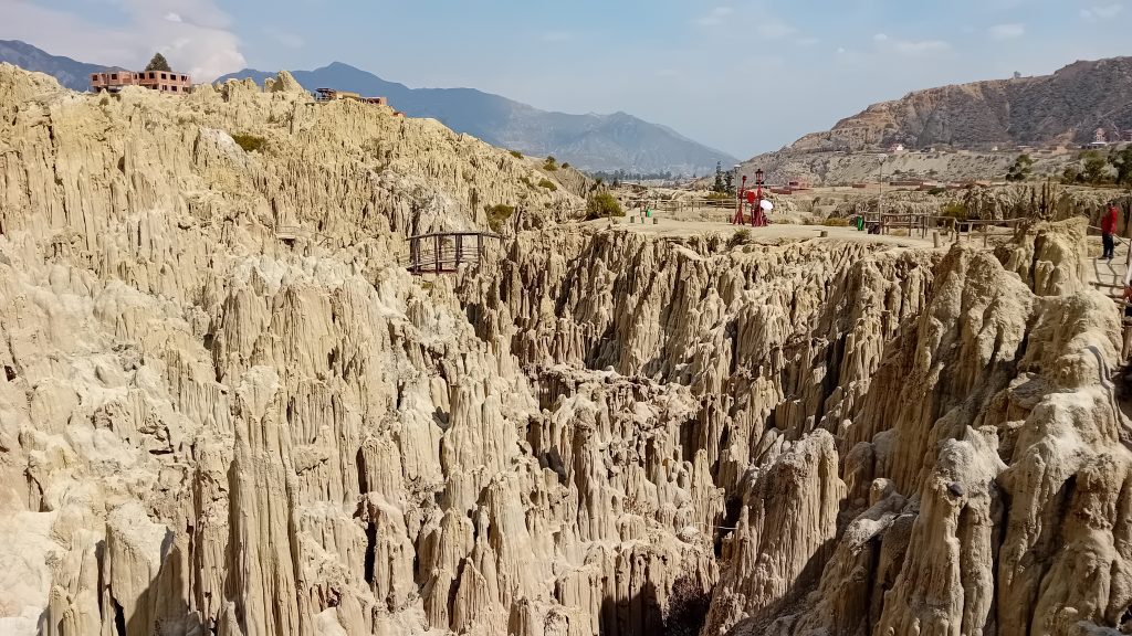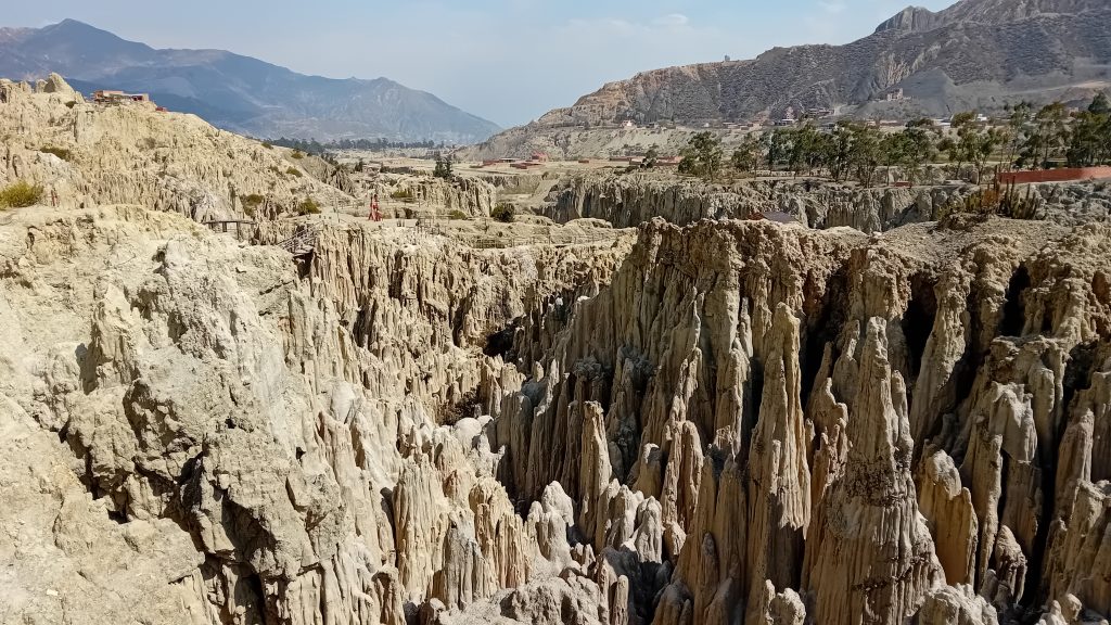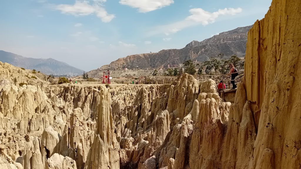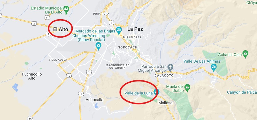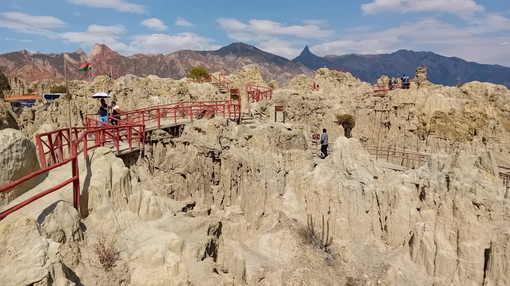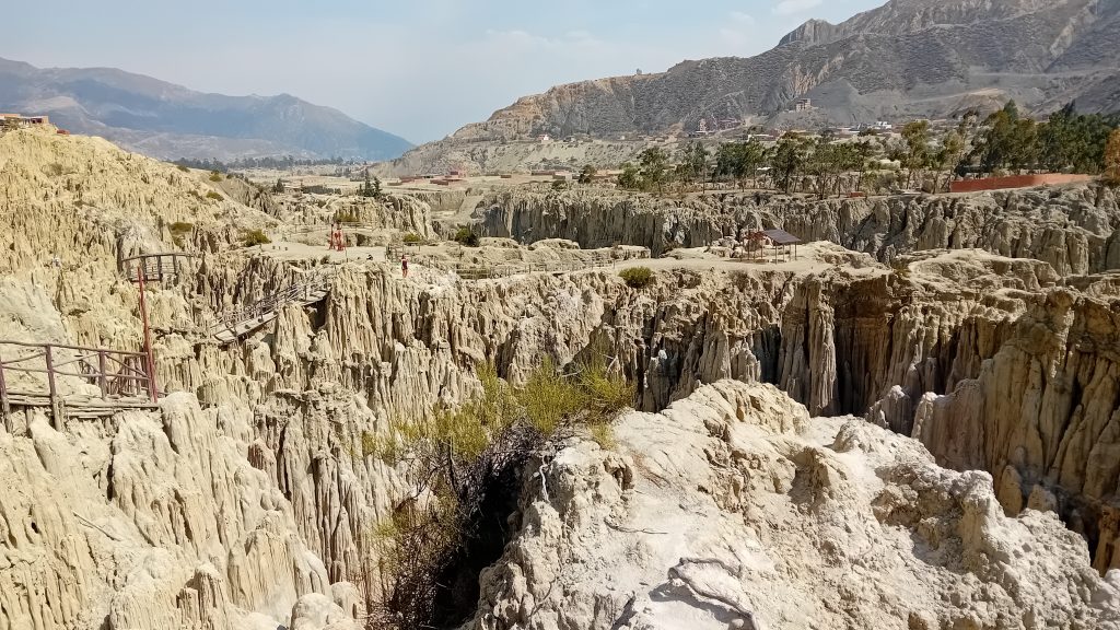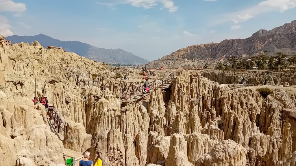La vallée de la Lune se trouve à environ 10 km au sud du centre de La Paz. Cette formation est due à l'érosion de la partie supérieure d'une montagne. Le sol composé de grès et d'argile a été érodé pendant des milliers d'années par l'eau et les vents pour donner forme à des tours et des cratères, ce qui amena l'astronaute Neil Armstrong, lors de son séjour à La Paz en 1969, à nommer la colline " Valle de la Luna".