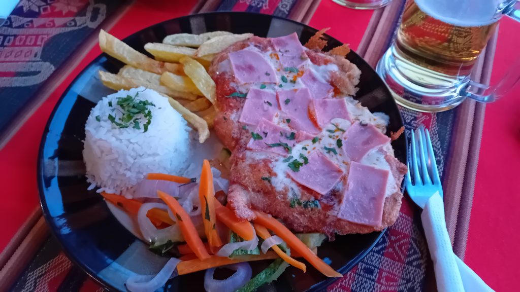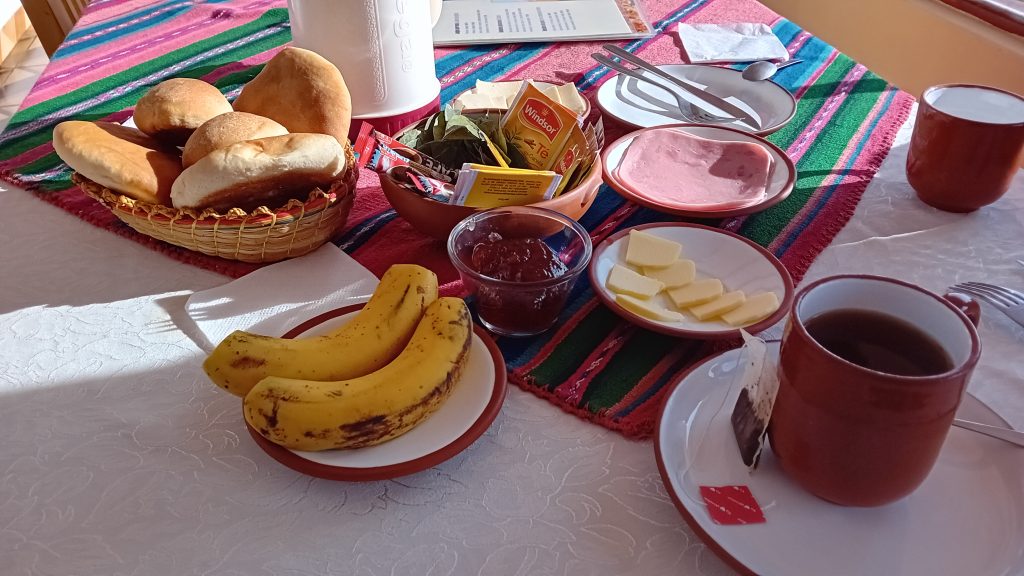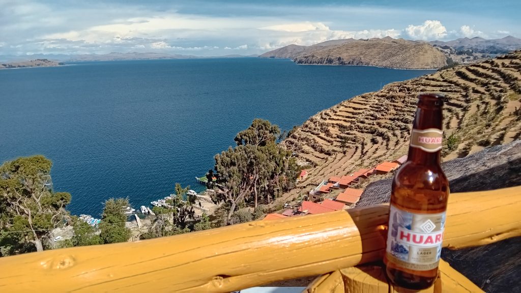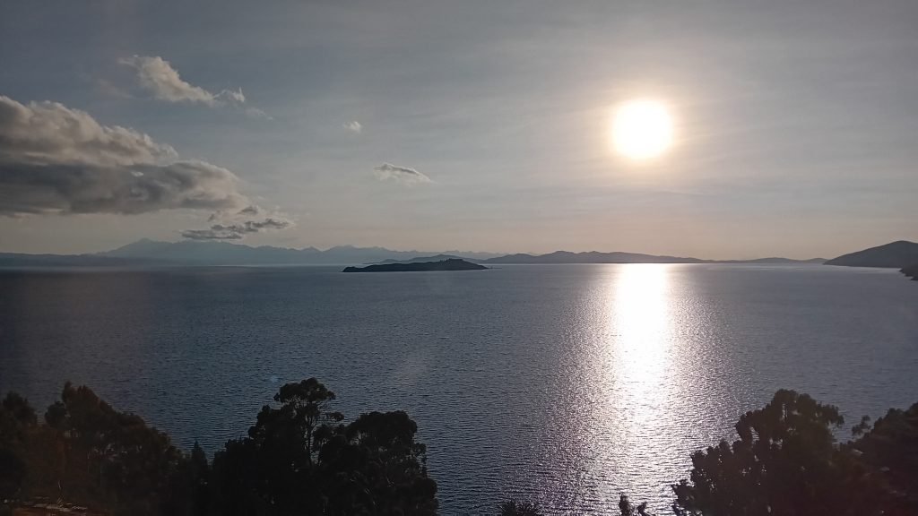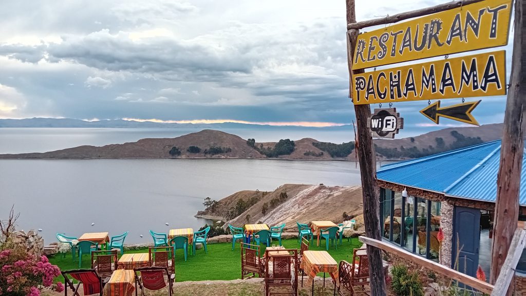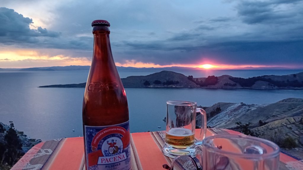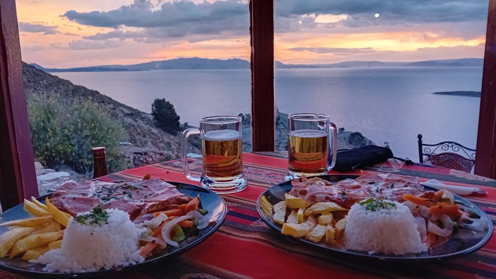 A la descente, un repas dans un des restaurants sur les hauteurs de Yumani pour admirer le spectacle d'un coucher de soleil sur le lac Titicaca.